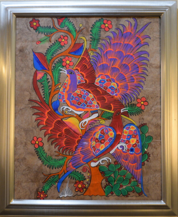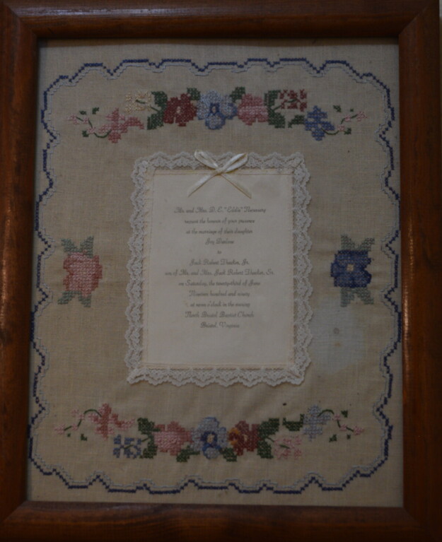 - Construction: The piece consists of nine printed cards mounted on a burlap backing, housed in a simple black composite or wood frame.