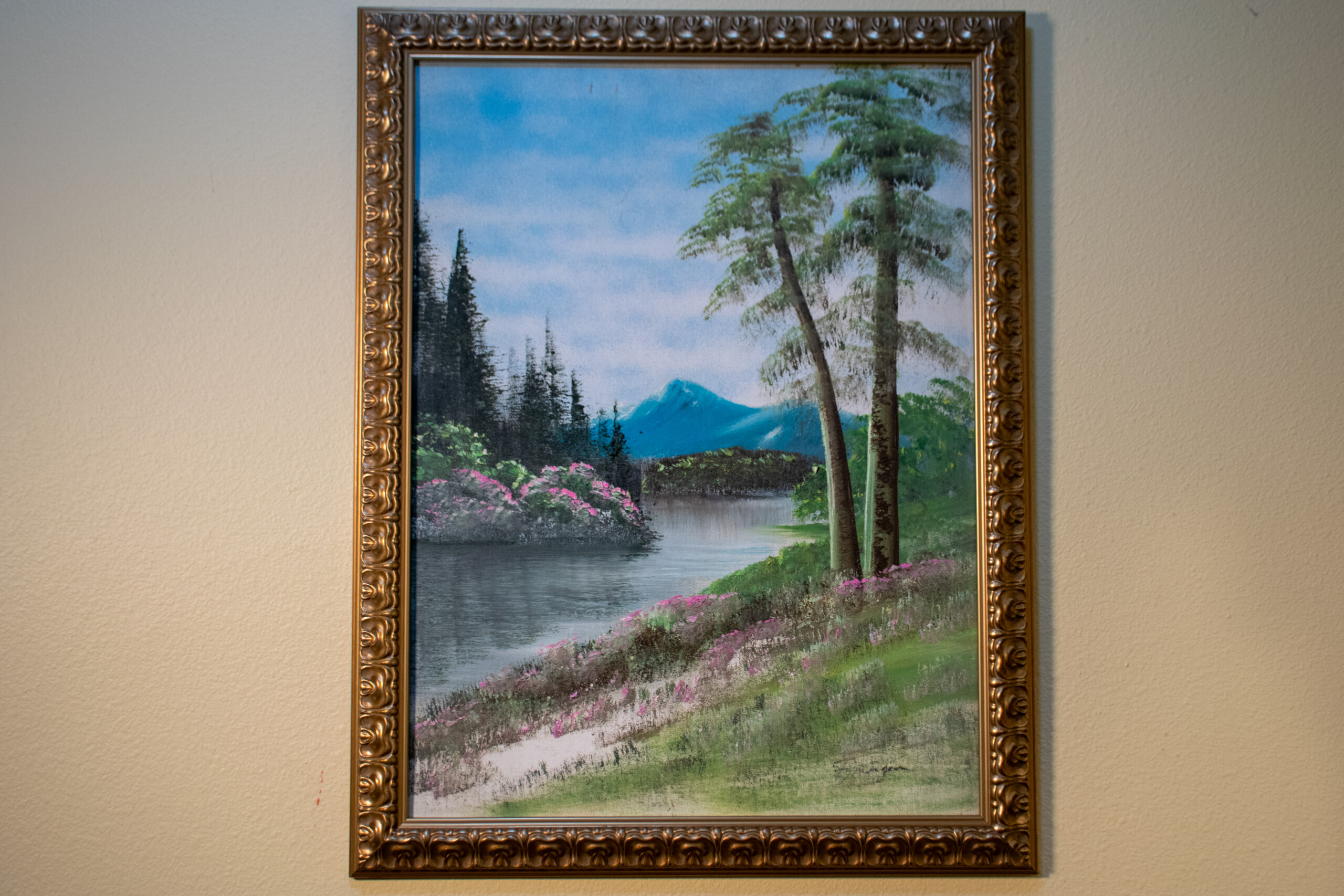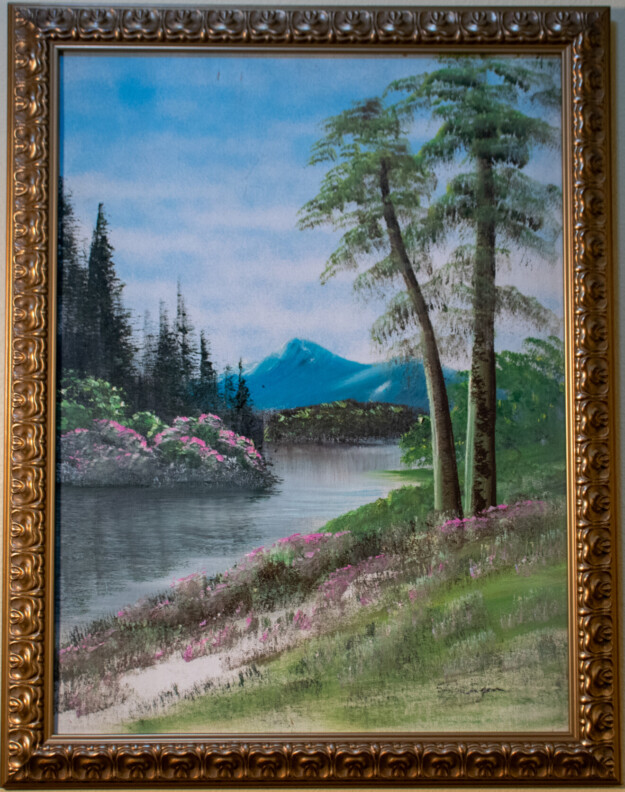 - Style & Technique: The painting utilizes classic Bob Ross elements: “happy little trees” (the tall evergreens on the left), fan-brush foliage (the pink flowering bushes), and a pallet-knife mountain in the background. The use of liquid white to create reflections in the water is a signature of this method.